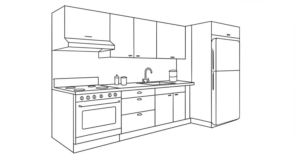line drawing, simple sketch, black and white, clean outline, kitchen